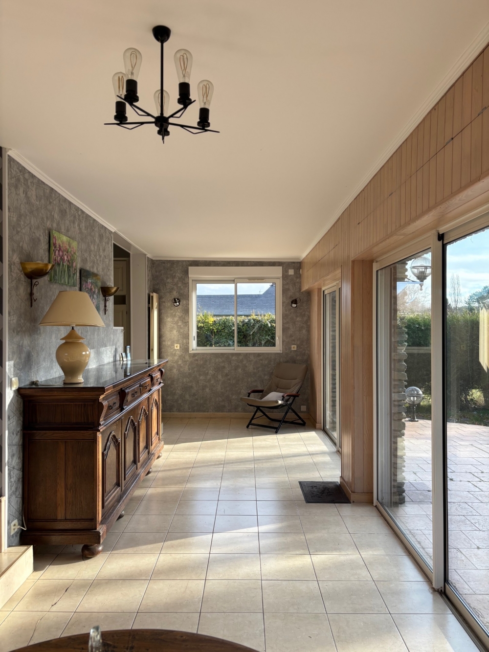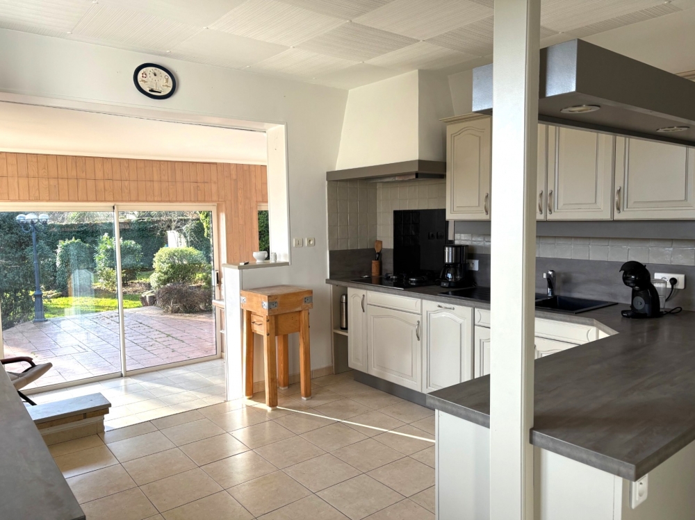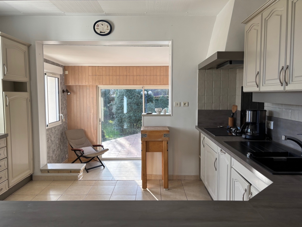 Offrant une distribution fonctionnelle, la maison s’ouvre sur une entrée desservant un séjour-salon convivial, prolongé par une salle à manger avec accès direct à la terrasse, idéale pour profiter d’une vue dégagée sur le jardin.