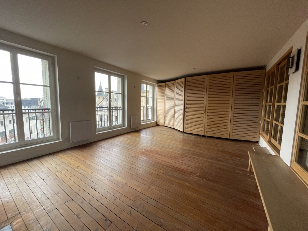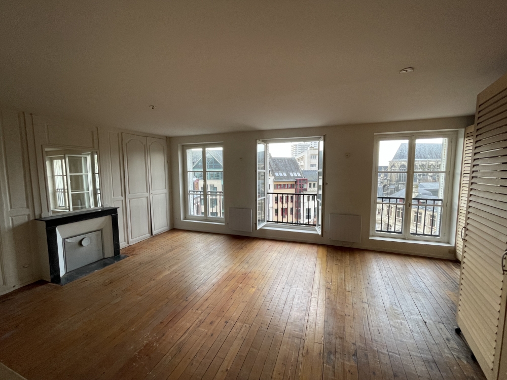 Place de la Pucelle, appartement au troisième étage, composé d'une entrée, chambre sur cour avec sa salle de douche, placard et wc, une deuxième salle de douche, wc, chambre, salon TV et un séjour avec cuisine ouverte.