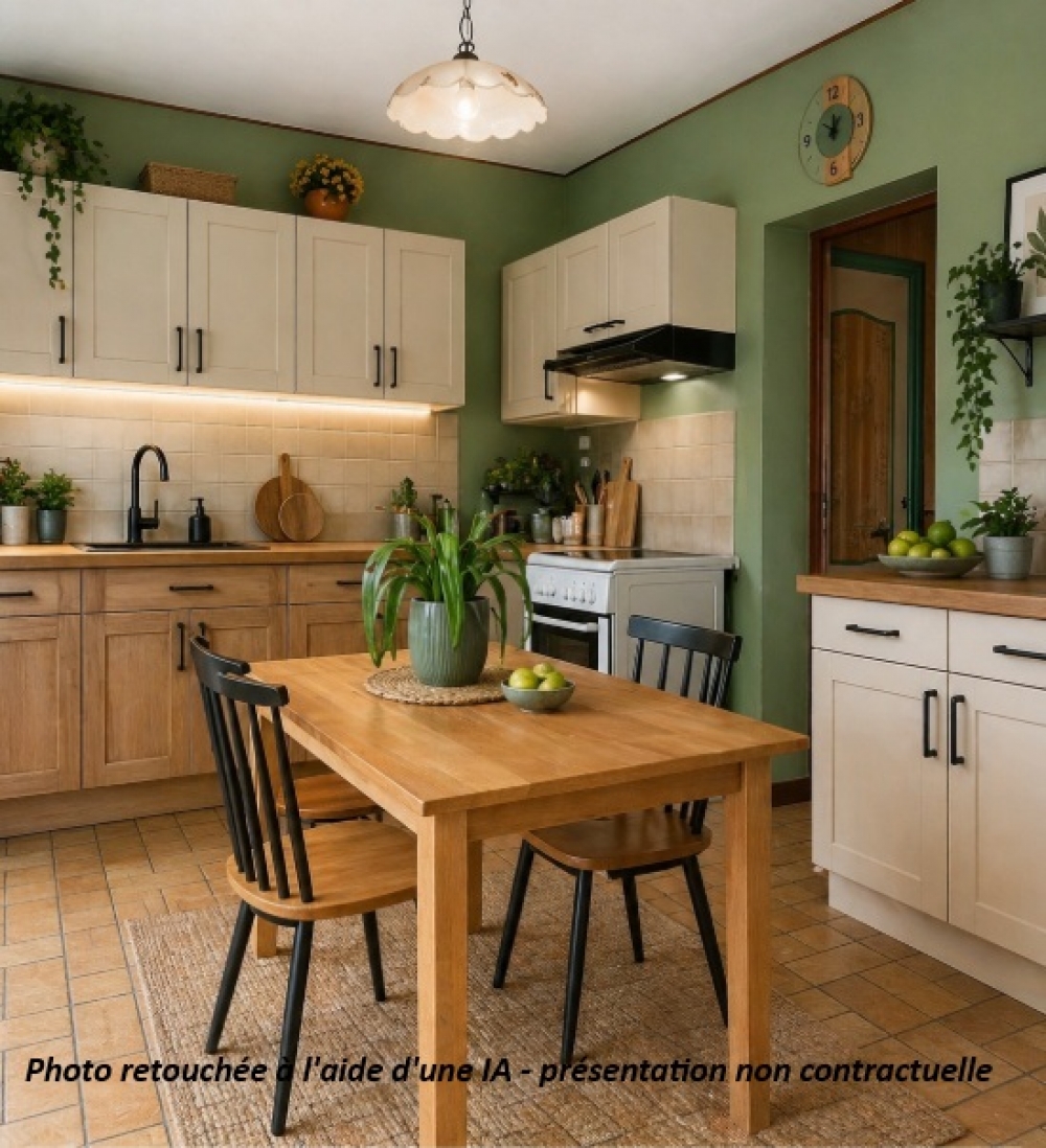 D’une surface d’environ 116 m², elle se compose d’une entrée, d’une cuisine, d’un séjour-salon de 35 m² avec poêle à granulés, d’une buanderie, ainsi que d’un dégagement desservant une salle de bains et un WC indépendant.
